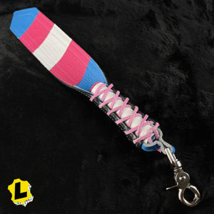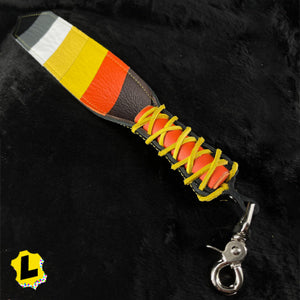 Genuine Leather laced slapper with a solid round grip and hanging clip. Chunky lobster clamp to attach to a ring or a belt loop.