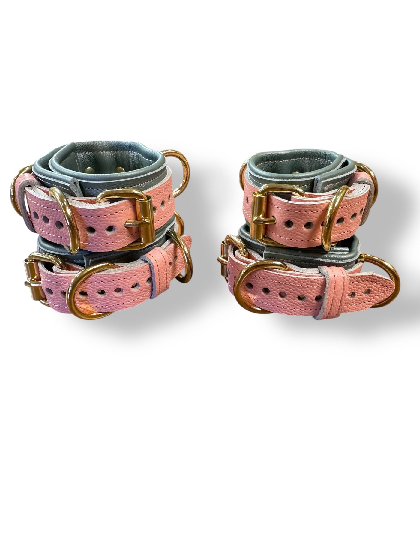 Wrist and ankle cuffs locally made with soft leather and gold hardware.